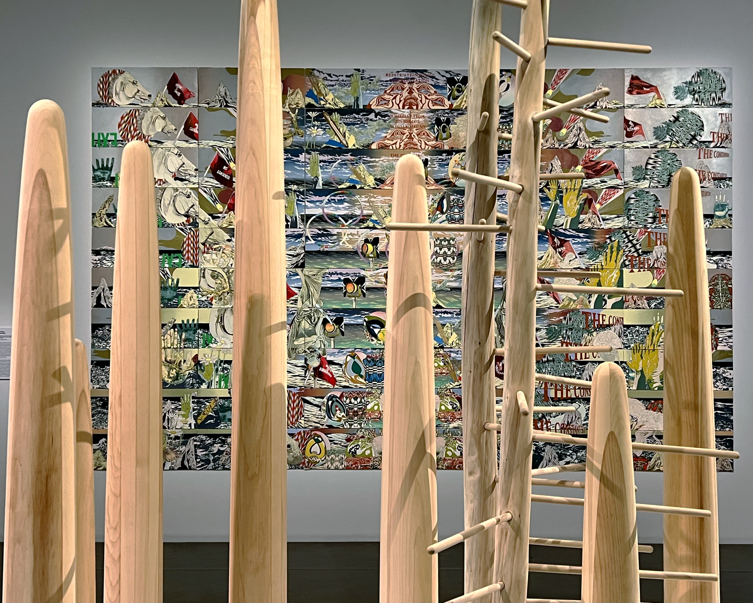 Aryana Leland (AL): Your work The Constant Sky was commissioned for the Denver Art Museum, and accompanied by the sculpture Columns for a Horizon in the gallery space. The placement is deliberate, where a viewer cannot step back and view the work head-on without stepping around and viewing through the columns. Your work often interrogates repatriation, the relationship between museum and artist, and a sense of access and denial. Do you envision that works in the Stacked Landscapes series should be accompanied by Columns for a Horizon in order to interrogate this access and context? Are you interested in further exploring sculpture in your work?