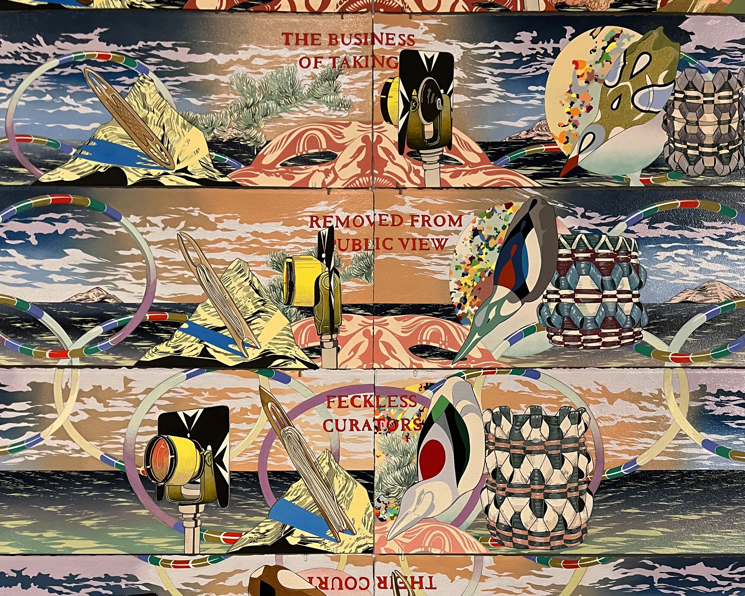 AL: In the video created for the exhibit, you appropriately speak to the fact that "there's a desire there to kind of to decode my work in a way." This is reiterated in your interview with Dakota Hoska, and this desire is also present within the exhibit. Visitors will spend time with your work pointing to specific references and symbolism, trying to decipher their meaning. It seems that each work tells a very clear, deliberate story for those with eyes to see it. Rather than asking you to translate it, what do you wish museum-goers would take away from your work? What is our responsibility as viewers?