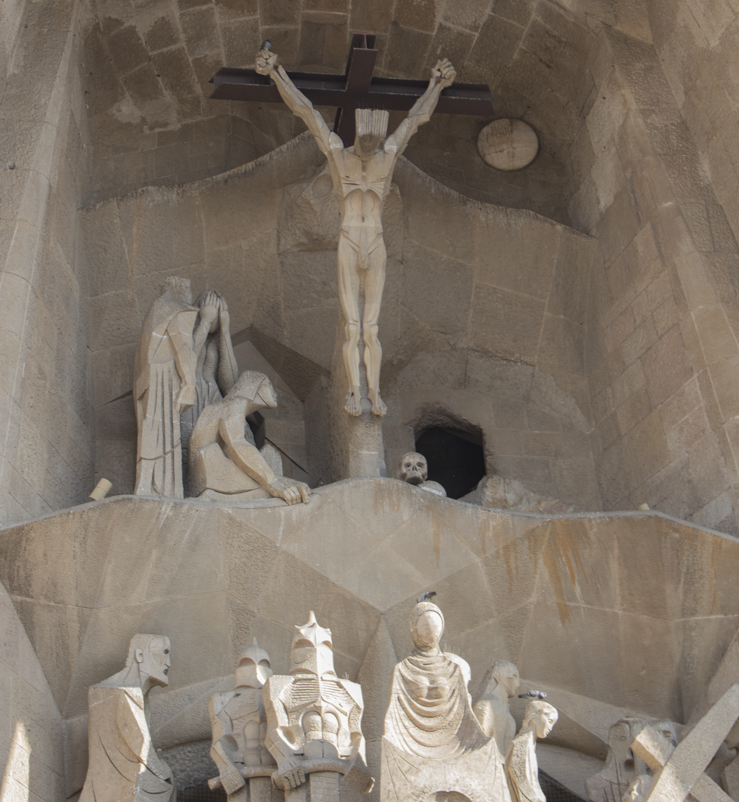Sculpture on the Passion Façade, on the other hand, resembles Medieval Romanesque sculpture, with noticeably abstracted human figures and motifs. The crucifixion takes place on weathered steel I-beams, with a memento mori at Christ’s feet. Our tour guide explained that the different art styles can be understood through Christ’s birth and death on the two main Nativity and Passion Facades, but it’s hard to ignore a one-hundred year shift in taste, craftsmanship, technology, and modeling techniques.