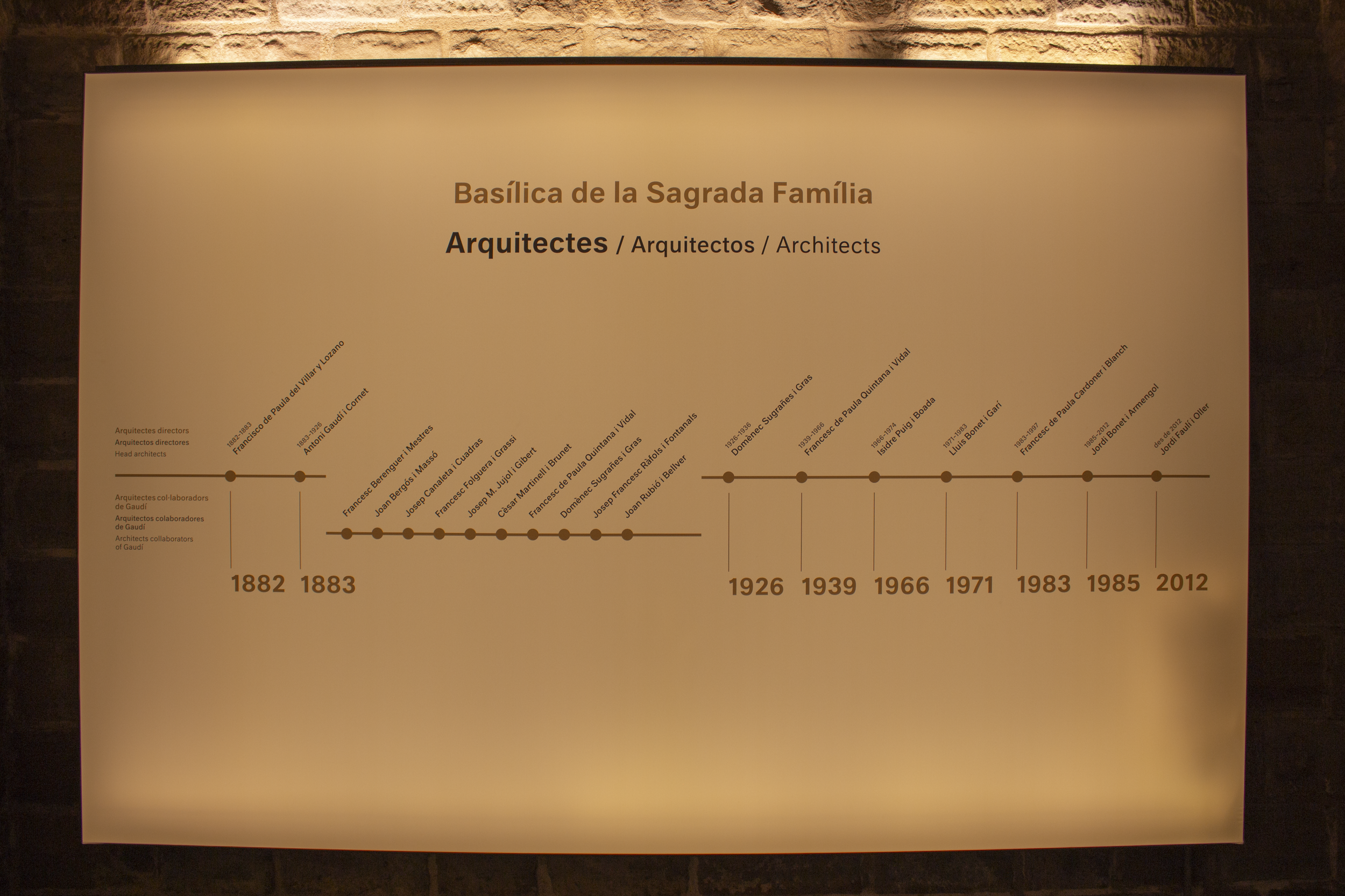 At the very, very, very end of the Museum, underneath the main basilica and just before the gift shop, there are two illuminated displays listing the chief architects and sculptors who have worked on Sagrada Família since its inception.